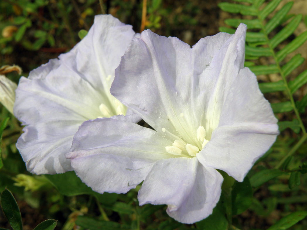Also known as Florida lady’s nightcap and Scrub morning glory, Florida bonamia (Bonamia grandiflora) is a rare, perennial flowering vine. Its showy blooms vary slightly in color from a bright blue in the morning to a pale lavender by the afternoon, at which time, the blooms close. They are solitary, five-lobed and funnel-shaped with white throats. Leaves are grayish-green and ovate with pointed tips, entire margins and tiny hairs. They are alternately arranged. Stems are hairy and herbaceous, arising in multiples from a single woody root mass and extending outward in different directions along the ground. Fruits are capsules that usually contain four smooth, oblong seeds.