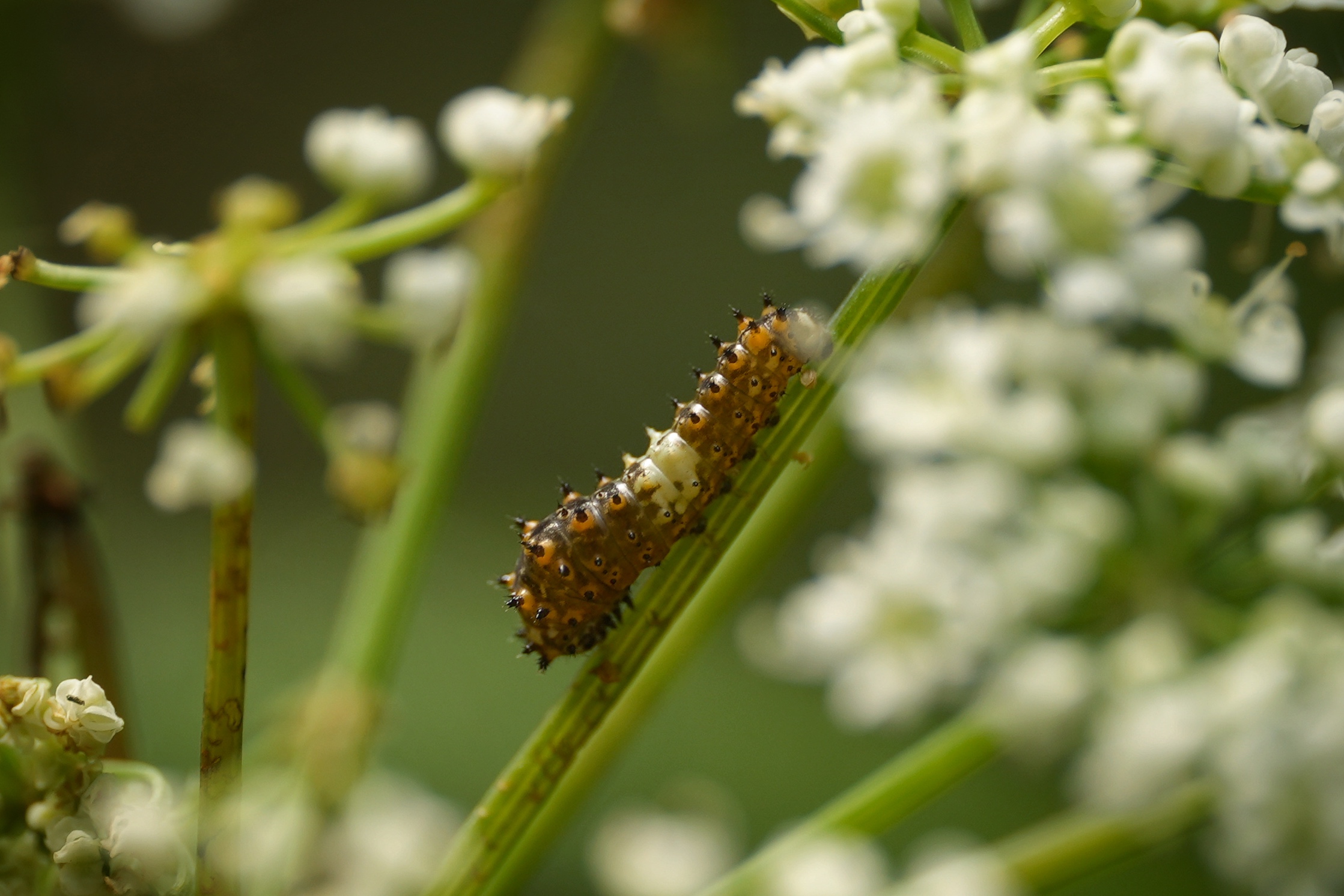 This beautiful butterfly is sometimes considered a pest for its love of herbaceous crops like carrots, celery and parsley, but it also makes its home among the little white flowers of their many lovely native relatives — and the highly toxic water hemlock!