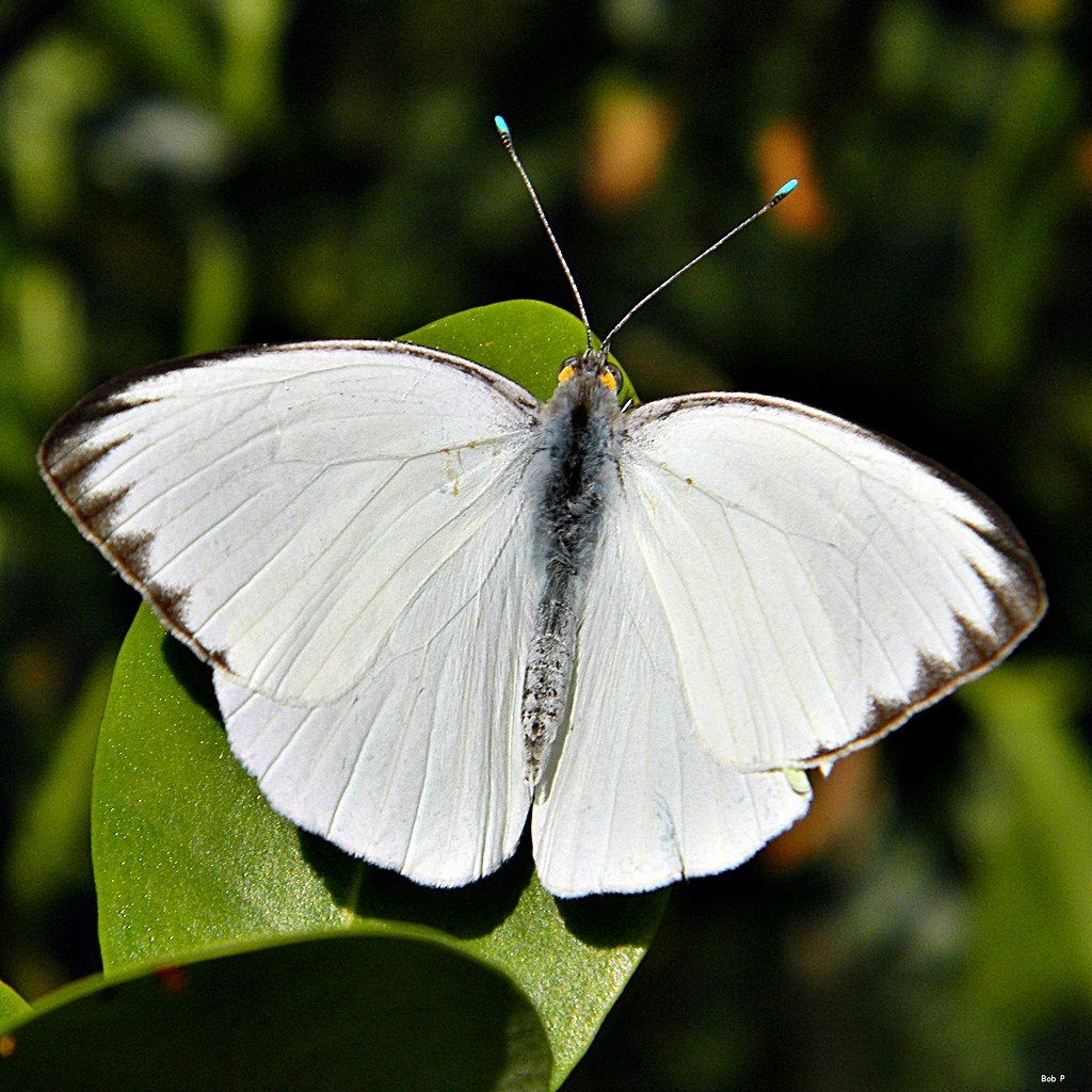 As its common name suggests, the Great southern white can be distinguished from other Florida “white” butterflies — such as the similarly widespread Checkered white (Pontia protodice) — by its larger size, with a wingspan of 1.5–2.25 inches. Unlike many other native whites and sulphurs, Great southern whites lack distinctive black spoting. Their coloration is sexually dimorphic: males have solid white wings edged with a thin black line at the forewing apex year-round, while females bear an additional dark spot near the apex and may develop darker, light-gray wings depending on daylight hours during metamorphosis. Both sexes share the species’ signature turquoise antennal clubs.